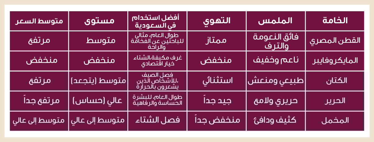 يعتمد الشعور بالدفء والراحة بشكل أساسي على نوع القماش المستخدم في المفرش. لكل خامة خصائصها الفريدة التي تجعلها مناسبة لتفضيلات واحتياجات معينة.