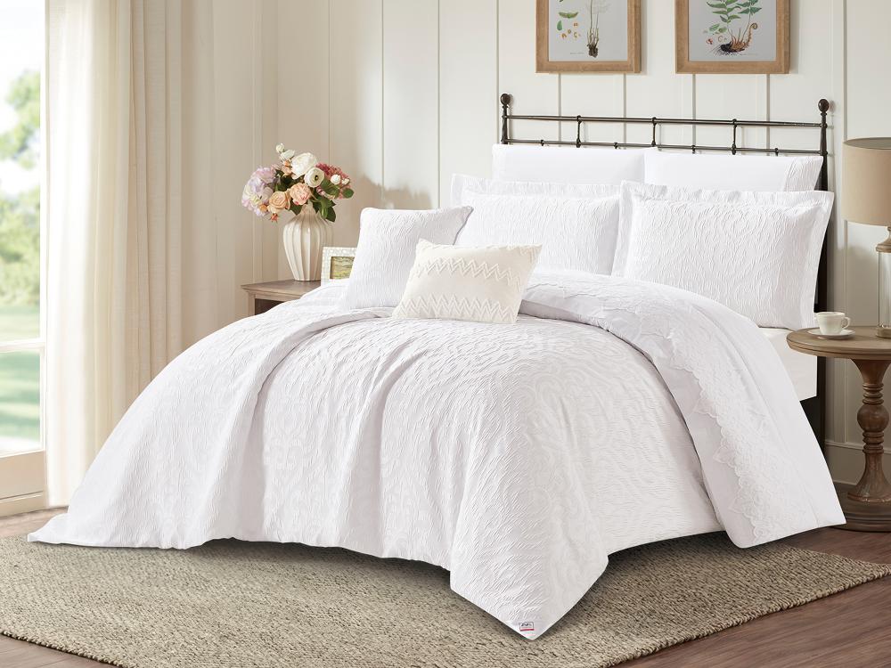 الماركة منبع الجودة والأناقة في كل تفاصيلها بتصميم ملكي أنيق باللون الأبيض النقي، مزين بنقوش جاكار راقية ولمسات دانتيل ناعمة تعطي إحساس بالفخامة والرقي في غرفة نومك.