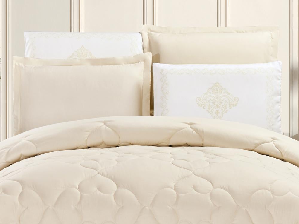 تأتي حشوة المفرش بسماكة متوسطة صيفية تم تثبيتها بدقة من خلال تطريز متين، مما يضمن بقاءها في مكانها ويمنحك تجربة نوم مريحة وخالية من القلق.